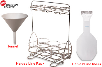 樣品離心收集袋系統(tǒng)(HarvestLine System或HarvestLine System Liner Kit),由一次性樣品收集袋 (Harvest Liners)、不銹鋼樣品裝填架(filling rack)、聚乙烯(polyethylene, PE)灌裝漏斗(Polyethylene funnel)、樣品收集袋底座(Base Spacers)及離心瓶適配器(Adapter Ring)組成。