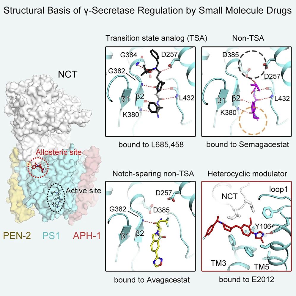γ- 分泌酶結(jié)合三種小分子抑制劑(Semagacestat、Avagacestat 和 L685,458)和一種調(diào)節(jié)劑(E2012)的原子分辨率冷凍電鏡結(jié)構(gòu)。
