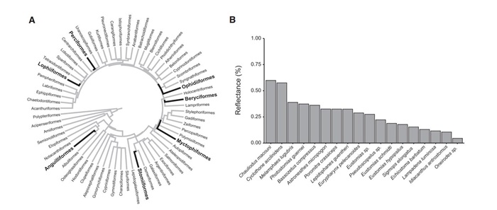 這些生物都具有超黑皮膚,反射的可用光不到0.6%,而其中16種反射不到0.5%。他們發(fā)現(xiàn)的最黑暗的物種是一種比高爾夫球座還短的琵琶魚(yú),其能吸收非常非常多的光線(xiàn),幾乎沒(méi)有光線(xiàn)反射回眼睛,反射回去的只有0.04%。